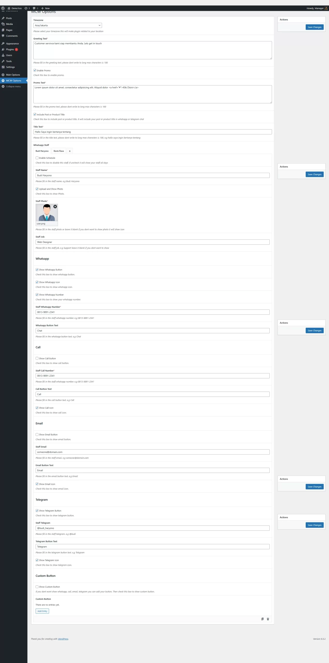 - Pilihan Whatsapp, Call, Email, Telegram dan custom button (progres pembuatan)