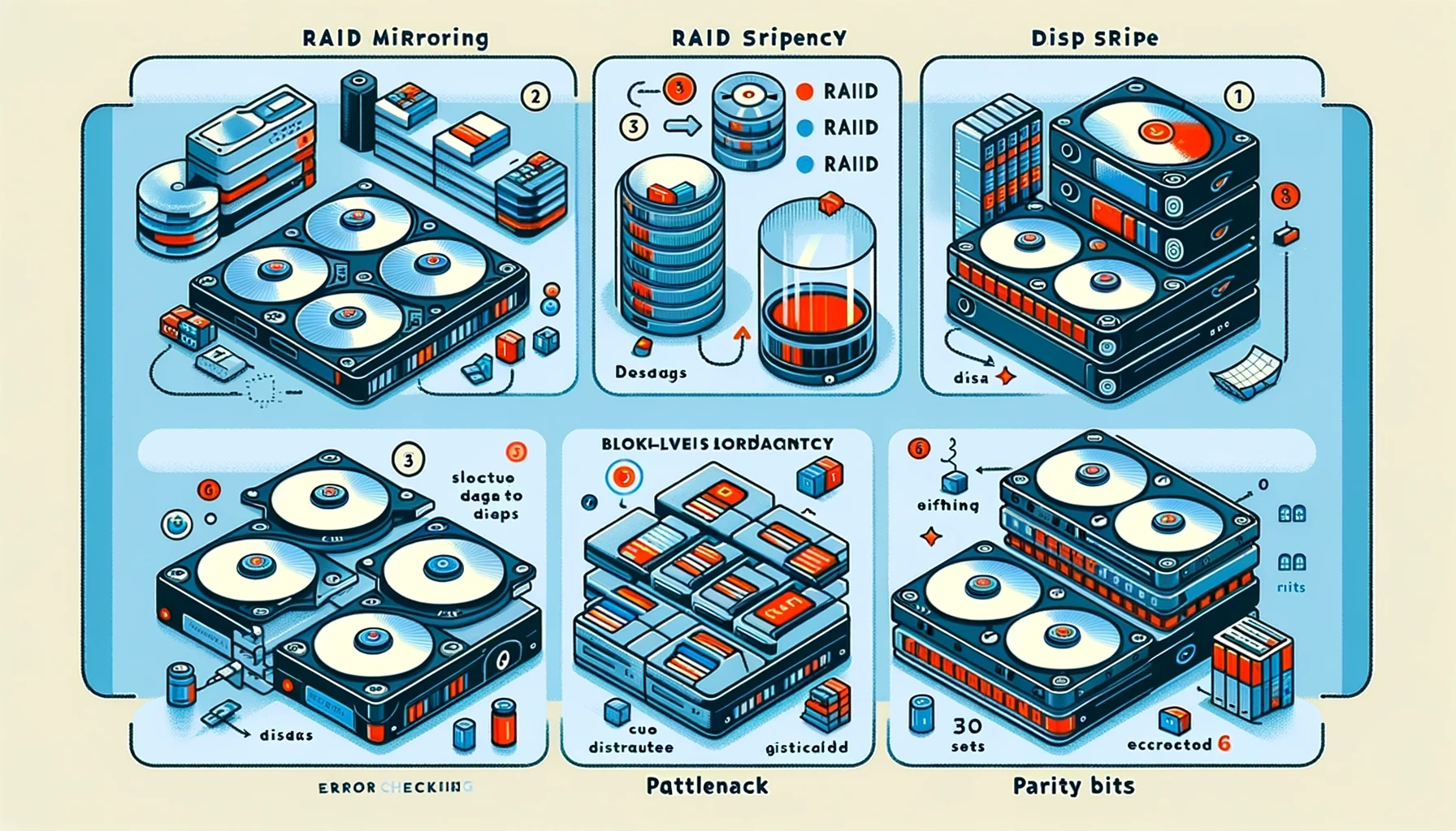 Di atas adalah ilustrasi visual yang menjelaskan berbagai level RAID dan konsep-konsep terkait. Gambar ini mencakup: